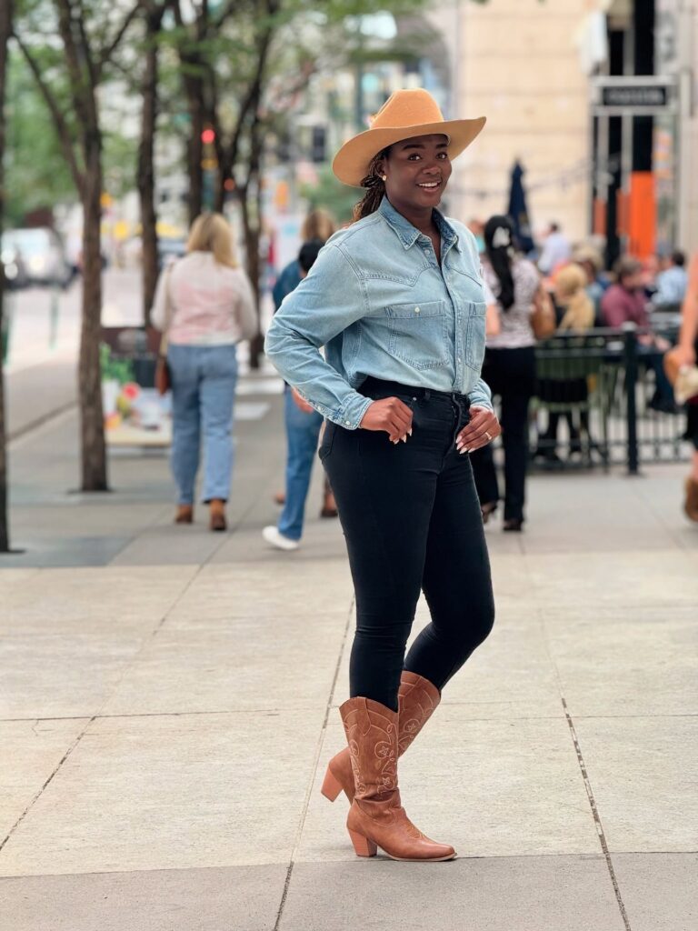 This timeless cowgirl outfit keeps things sleek and authentic. A light denim button-up shirt brings a structured, Western feel, tucked neatly into high-waisted black skinny jeans that create a flattering silhouette.