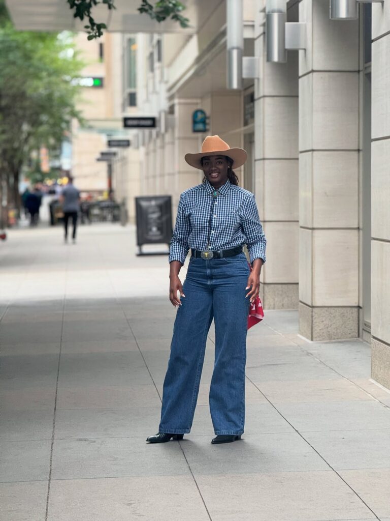 This cowgirl outfit brings a retro twist to classic Western style. A blue-and-white gingham button-down shirt sets a traditional tone, tucked into high-waisted wide-leg jeans for a vintage silhouette that feels fresh and fun.