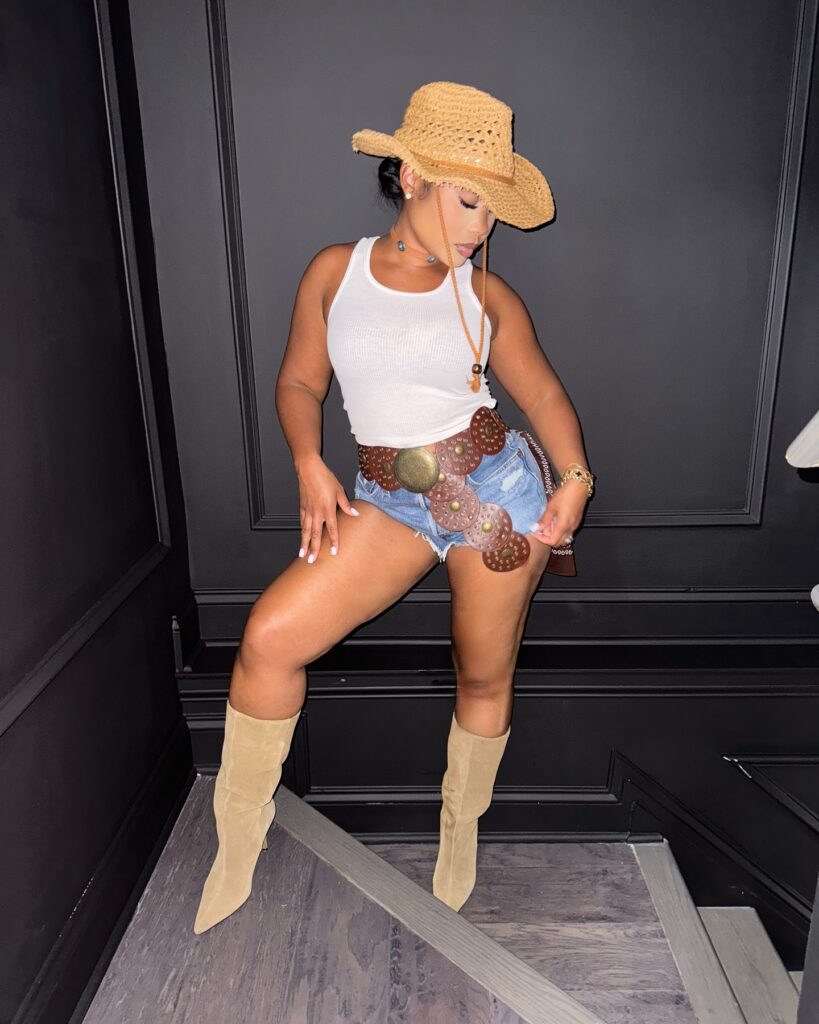 The oversized Western belt with a large buckle adds structure and draws attention to the waist. Finished with sleek white knee-high boots and a straw cowgirl hat, this look is built to command the room. It’s a fearless take on cowgirl style that’s perfect for parties, concerts, or themed nights out.