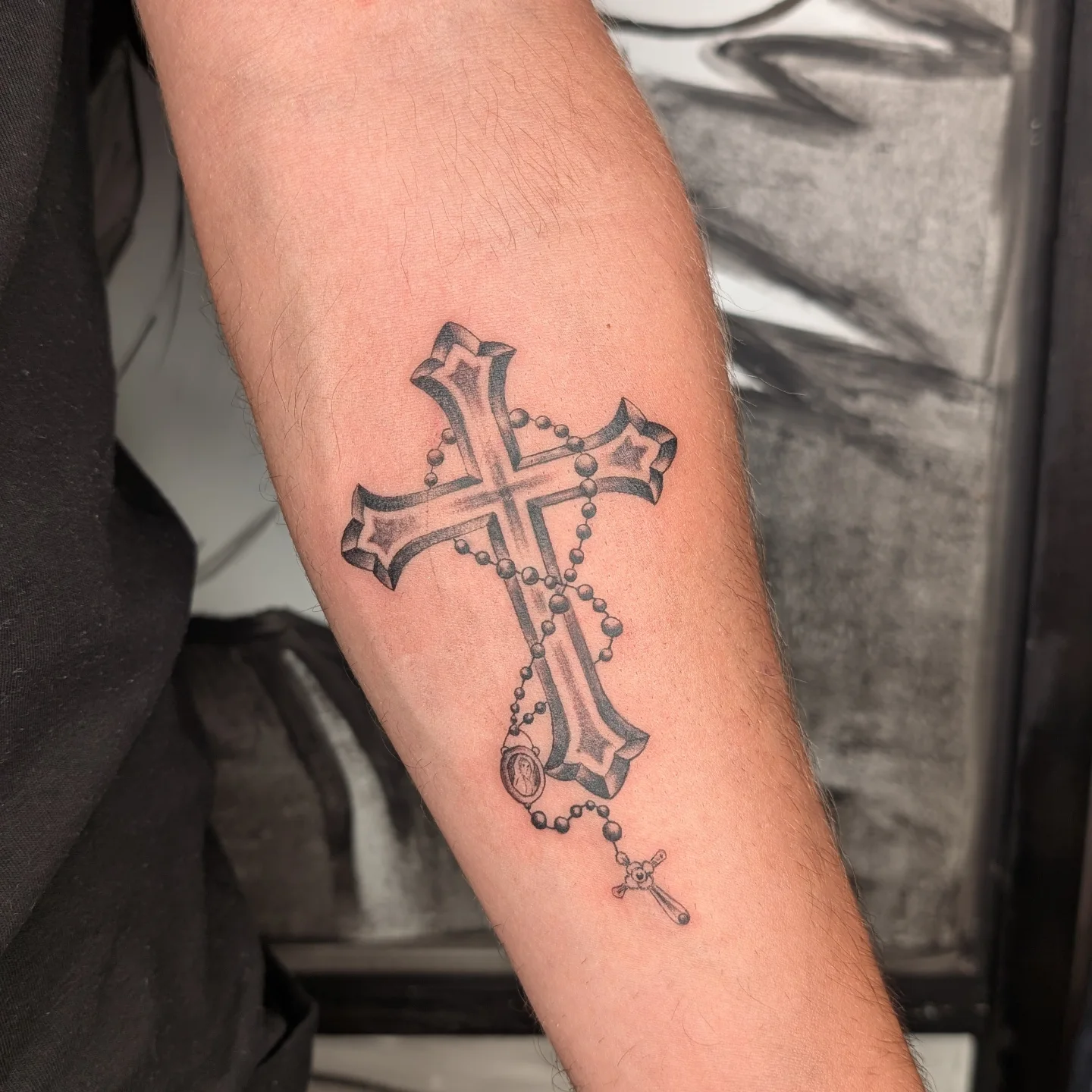 This tattoo shows a large cross paired with draped rosary beads, placed on the forearm and set in front of a soft shaded background. The shading makes the cross feel lifted from the skin, almost three-dimensional, while the beads fall naturally to create movement.