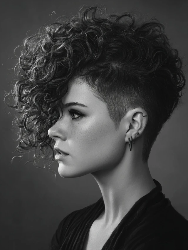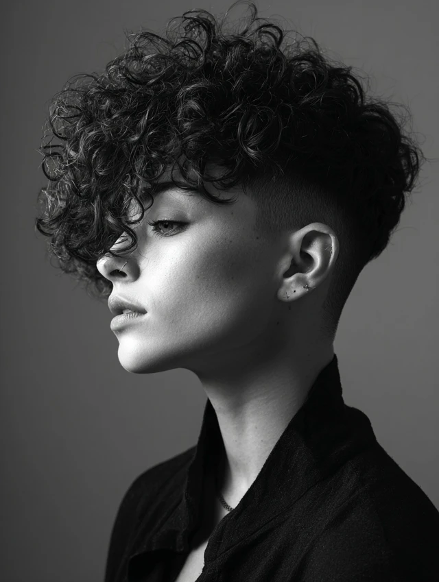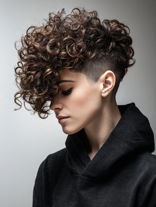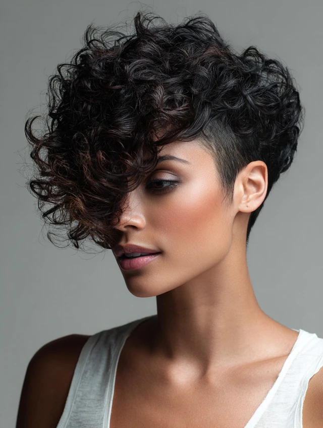 The curly pixie with an undercut has shaved or tapered sides while keeping curls long on top. It works for oval, round, and heart-shaped faces, adding structure and volume. Medium to thick curls respond best, giving a defined and edgy silhouette.