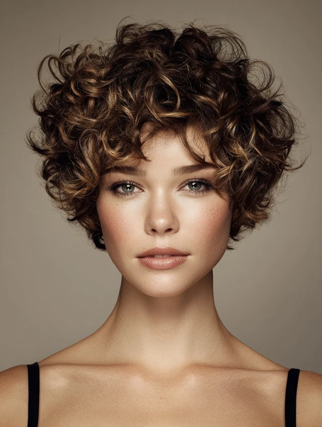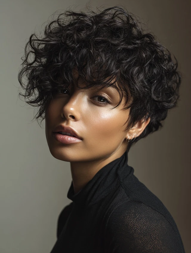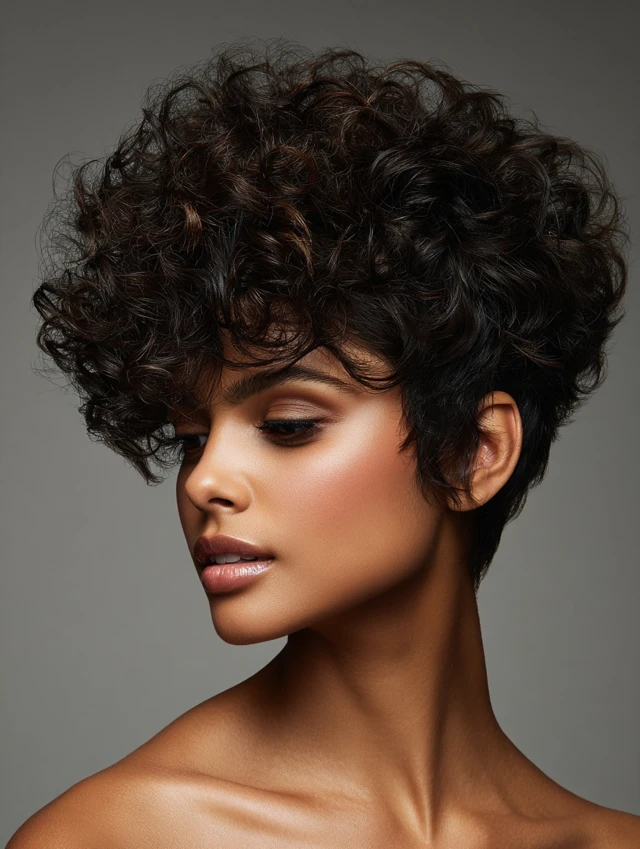 The voluminous curly pixie emphasizes height at the crown with layered curls throughout. This adds fullness and frames the face beautifully. Oval, round, and heart-shaped faces benefit most. Medium to thick curls create natural bounce, while fine curls may need light mousse for lift.