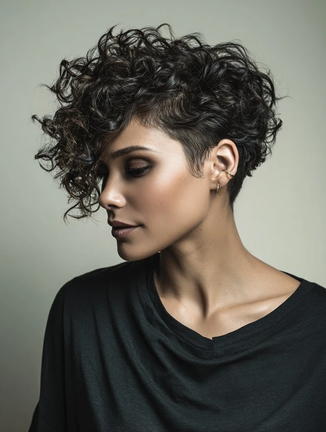 The asymmetrical curly pixie features longer curls on one side with a shorter, tapered opposite side. It works well for oval, round, and square face shapes, adding interest and dimension. Medium to thick curls hold the asymmetry naturally, giving a bold, modern look.