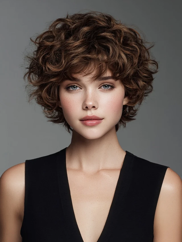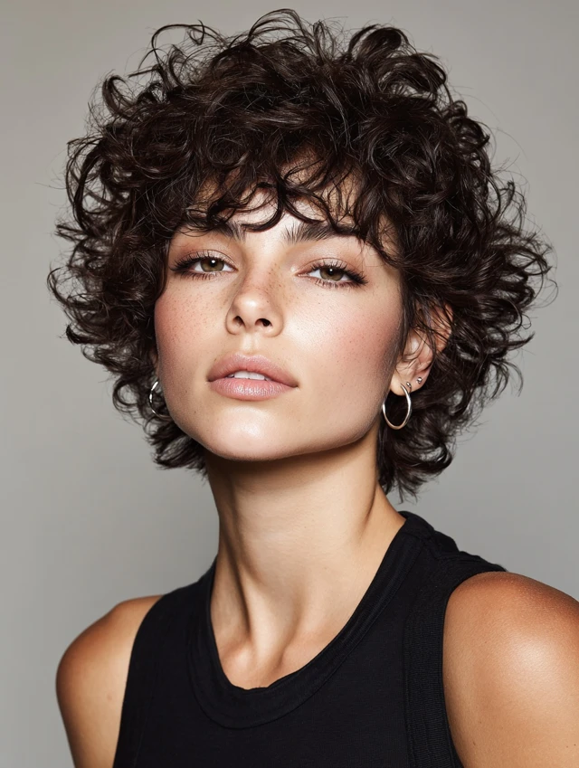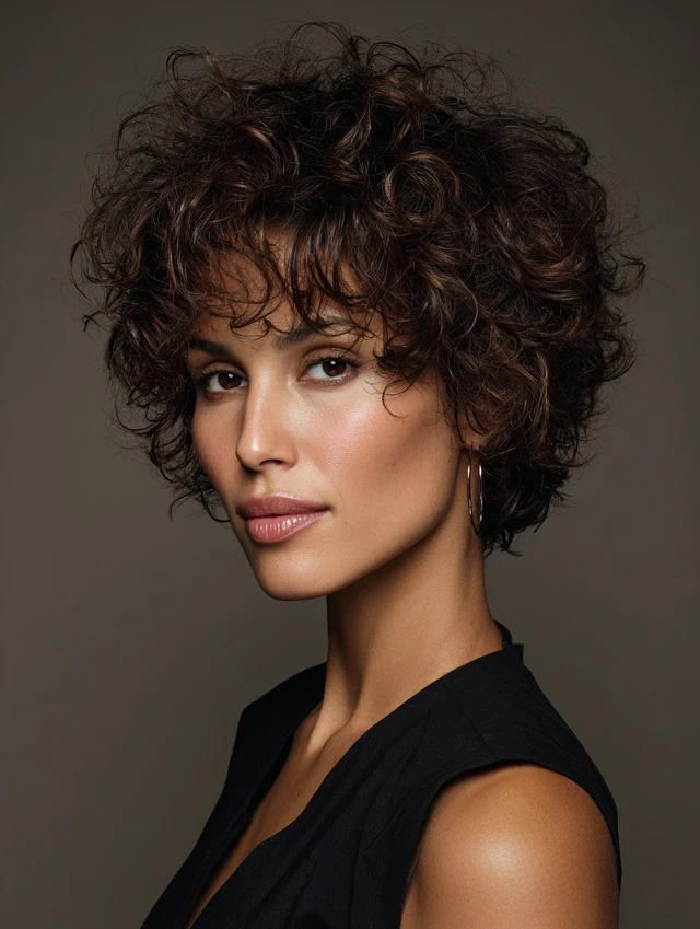 Short curly shags focus on cropped crown layers with textured ends to define curls and add volume. Works best for round and heart-shaped faces. Medium to thick hair maintains bounce and shape naturally.