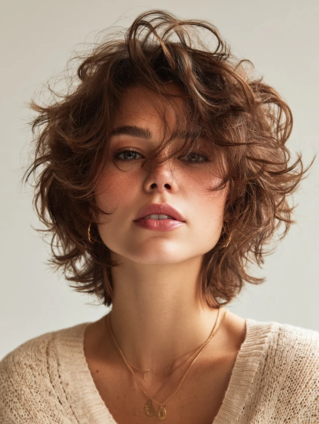 Tousled curly shags create a messy, carefree texture with feathered layers that add playful movement. Works for oval and square faces. Medium to thick curly hair responds well to tousled styling.