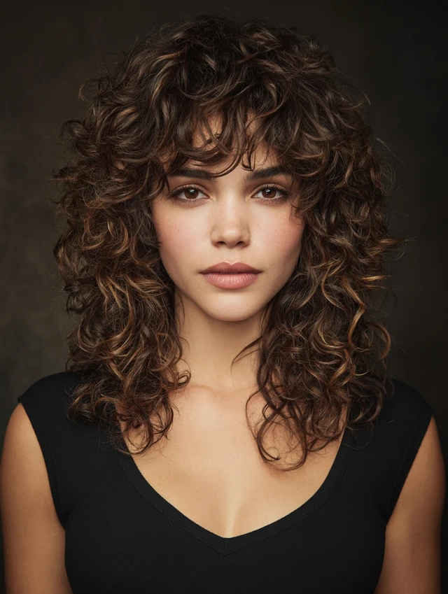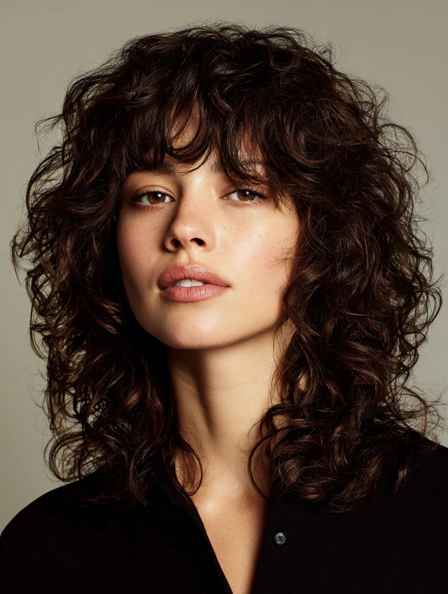 Curly shags work because the layers distribute volume evenly, preventing curls from appearing heavy or triangular. The feathered ends give movement and softness around the face.