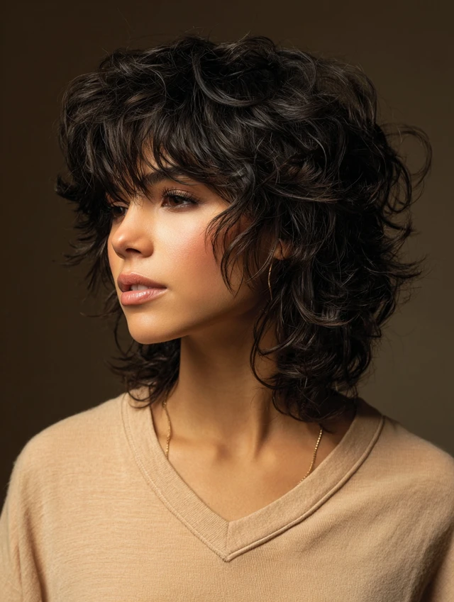 The classic curly shag features layered crown hair with feathered ends to enhance natural curl patterns. Works well for oval, round, and heart-shaped faces. Medium to thick curly hair shows defined volume and natural bounce.