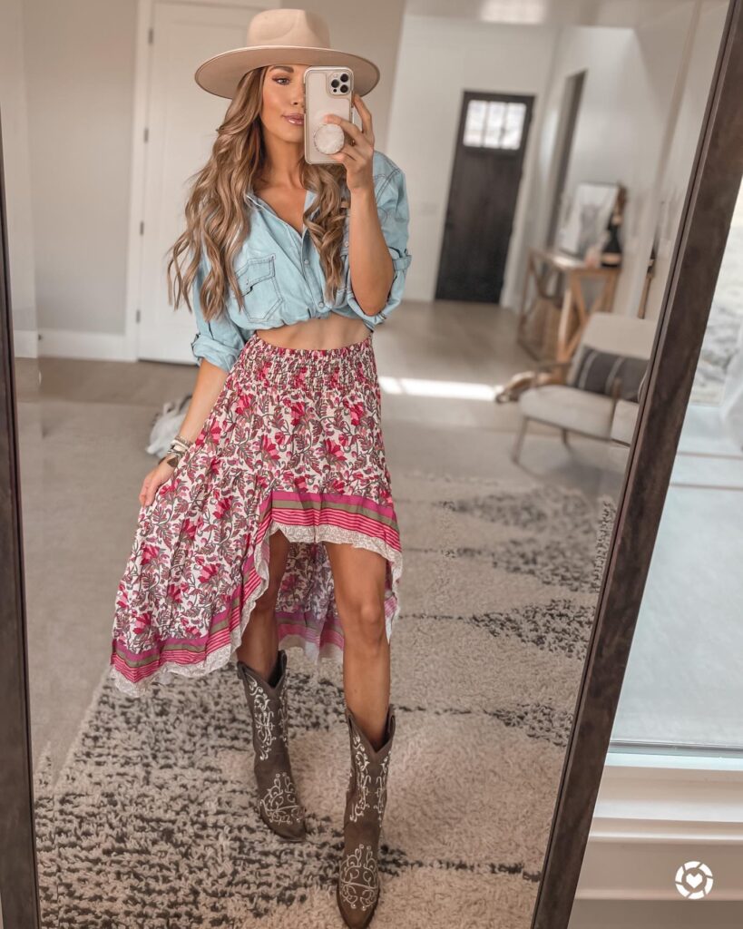 This cute and breezy concert look pairs a tied chambray shirt with a high-low floral boho skirt. The light denim top adds a relaxed country vibe, while the pink and white patterned skirt brings playful movement and charm.