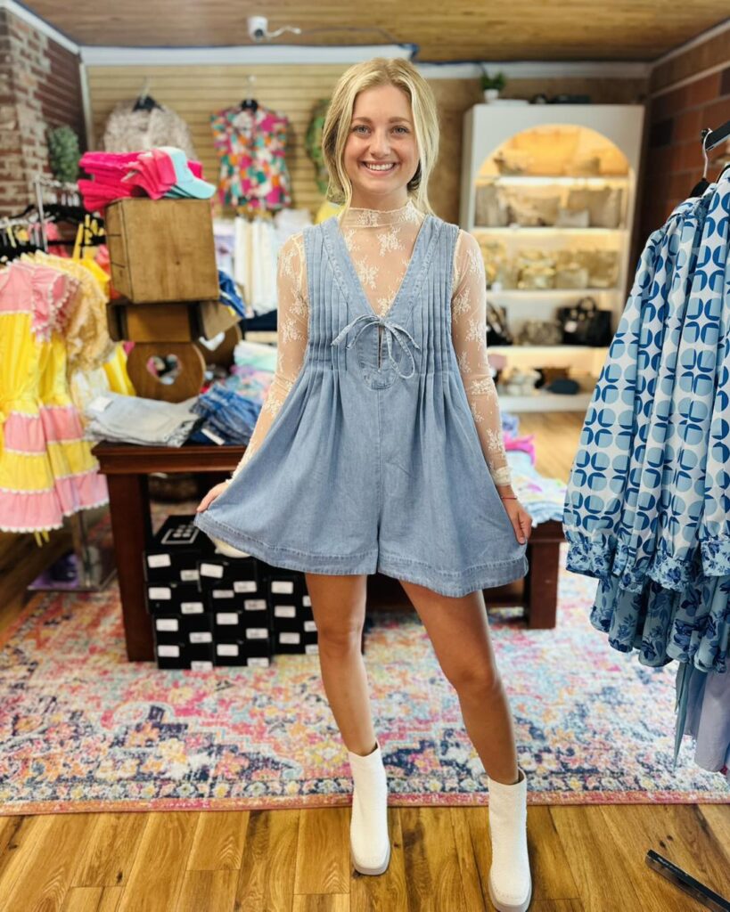 This sweet concert outfit features a light denim romper layered over a sheer lace long-sleeve top. The playful tie-front detail and flowy fit keep the look relaxed and girly.