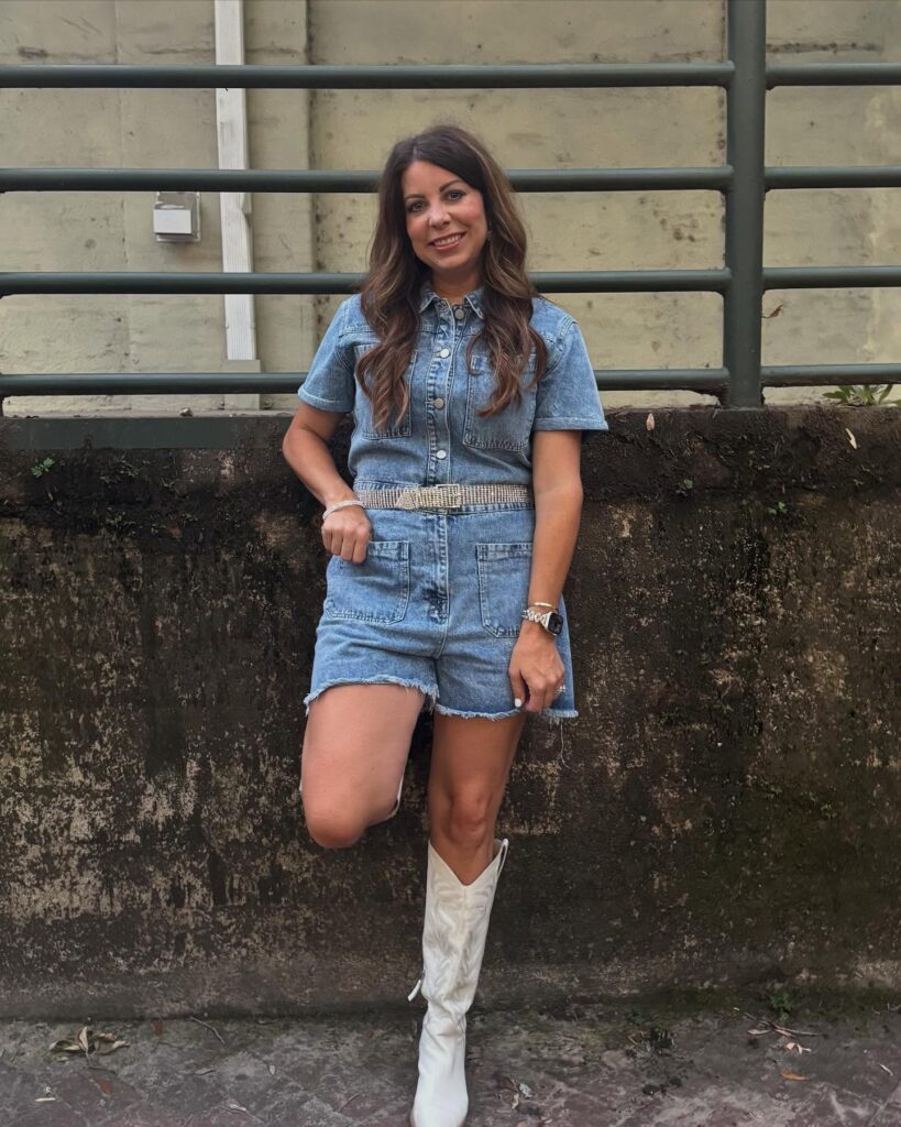 This cute concert outfit features a belted light wash denim romper with a front zipper and structured collar. The tailored fit and short sleeves offer a sleek, polished vibe while keeping things fun and casual.