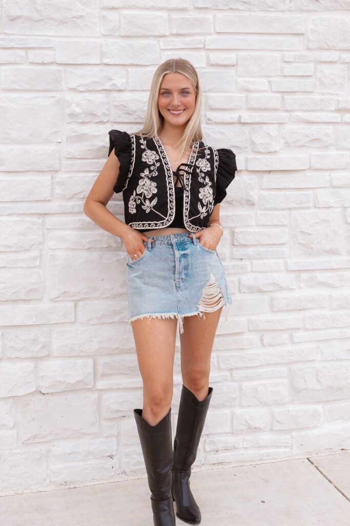 This cute concert outfit features a black embroidered crop top with flutter sleeves and floral detailing for a fun, boho twist. Paired with a distressed light-wash denim mini skirt, the look feels effortlessly edgy yet feminine.