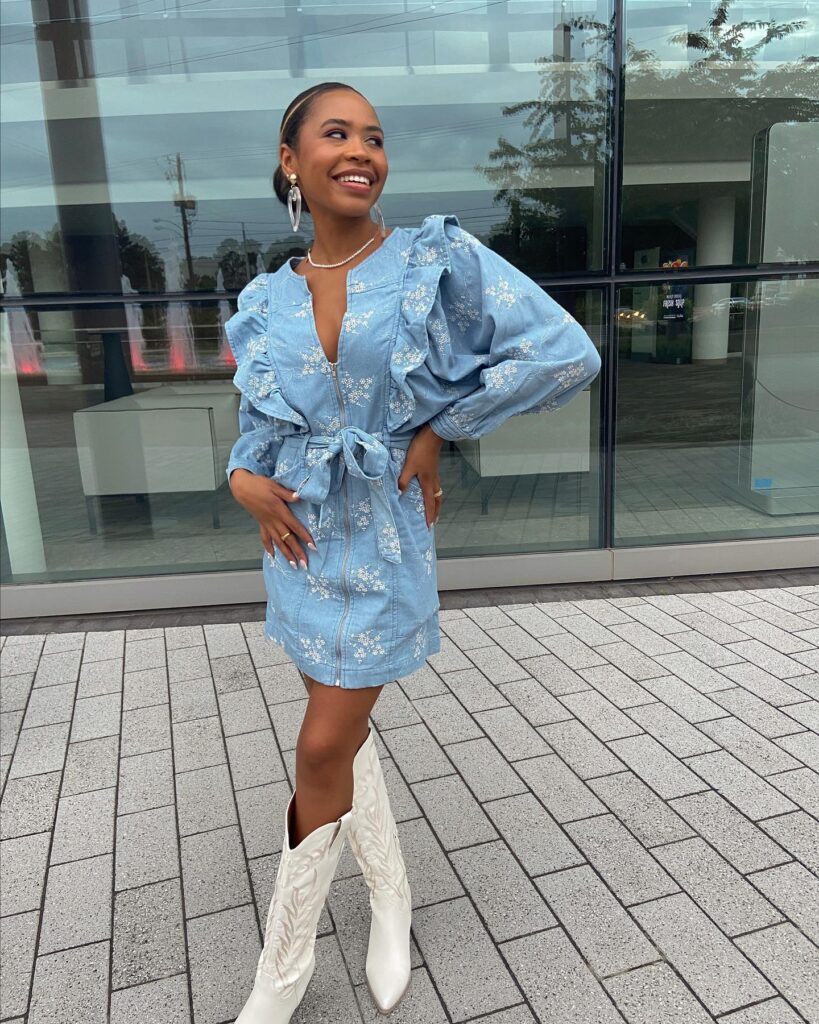 This stylish concert outfit features a belted denim mini dress with delicate white floral prints and dramatic ruffle detailing. The structured fit adds shape, while the puffed sleeves and subtle V-neck give it a feminine twist.