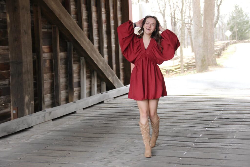 This adorable concert look centers around a burgundy mini dress with flowy bishop sleeves and a gathered waist. The deep V neckline and airy silhouette create a soft, romantic feel that moves beautifully.