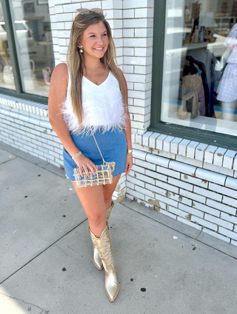 This fun and flirty concert look features a white feather-trimmed tank that adds instant glam. It’s paired with a classic blue denim mini skirt, offering a youthful and casual vibe.