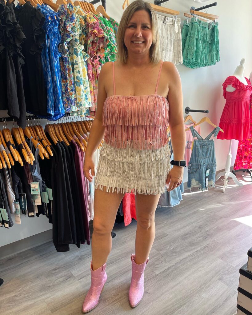 This playful concert outfit features a fun fringe mini dress with ombré shades of pink and white that move with every step.