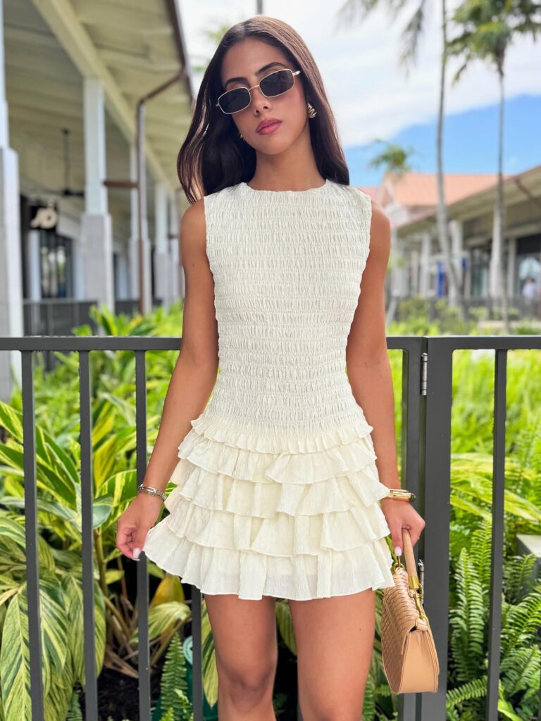 This elegant concert outfit features a cream mini dress with a smocked bodice and playful tiered ruffle skirt. The front is simple and sweet, while the open back with tie detail adds a flirty twist.