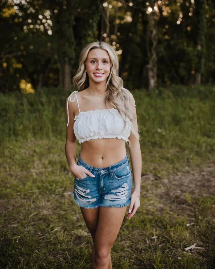 This easygoing concert look features a white ruffled crop top with tie straps that adds a soft, flirty feel. It’s paired with distressed high-waisted denim shorts for a casual, sun-ready vibe.
