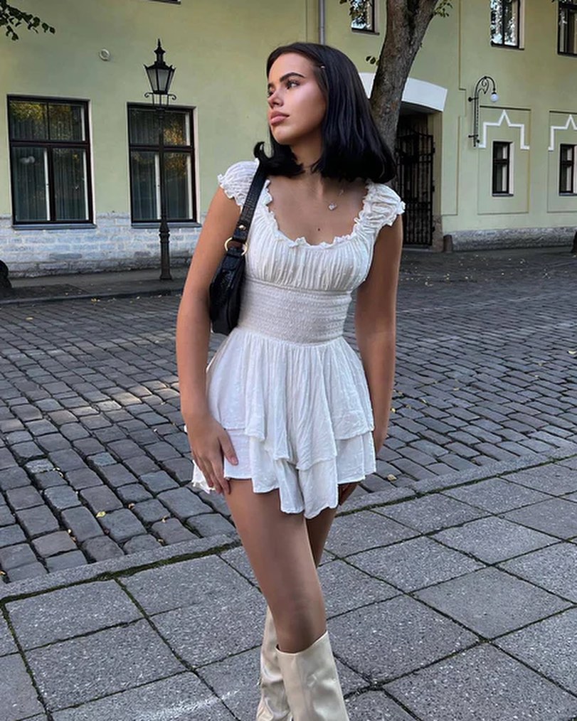 This dreamy concert outfit features a ruffled white romper with a smocked waist and tiered skirt for a soft, romantic silhouette. The cap sleeves and delicate neckline give it a feminine, vintage feel that’s both charming and flirty.