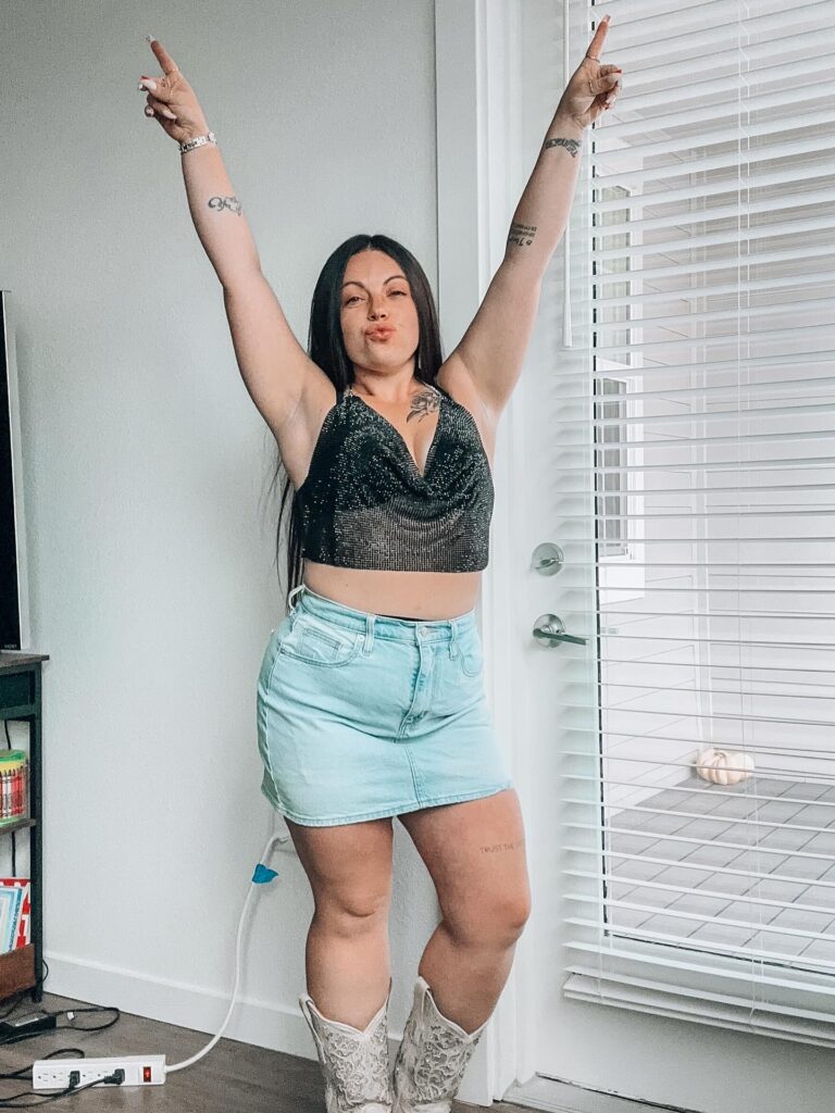 The mix of shimmer and casual denim creates a fun, carefree vibe. The addition of white embroidered cowboy boots adds a playful country edge. It’s a confident and festive look that’s ideal for dancing, celebrating, and making memories at your favorite show.