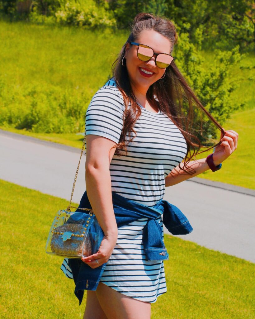 This comfy concert look features a classic black and white striped t-shirt dress that’s both casual and cute. Tied around the waist is a denim jacket, adding a laid-back, practical layer that’s perfect for changing weather.