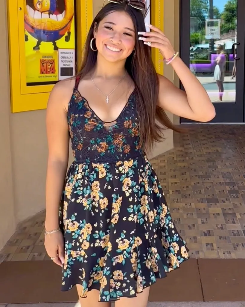 This flirty concert outfit features a black sundress with a fitted lace bodice and a yellow floral skirt. The V-neckline adds a feminine touch, while the flowy ruffled hem creates playful movement.