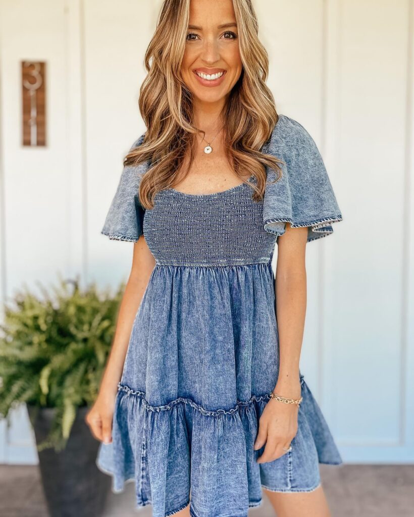 This cute concert outfit features a soft, washed denim babydoll dress with a smocked bodice and flowy tiered skirt. The flutter sleeves add a playful touch, while the relaxed fit keeps things comfy and breezy.