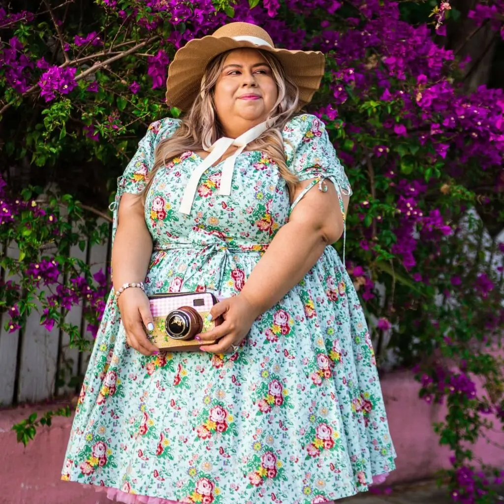 Its flared skirt flows gently over curves, making it ideal for sunny outings or garden days. Feminine, breezy, and timeless, this outfit blends classic style with everyday comfort for a confident, cottagecore-inspired look.