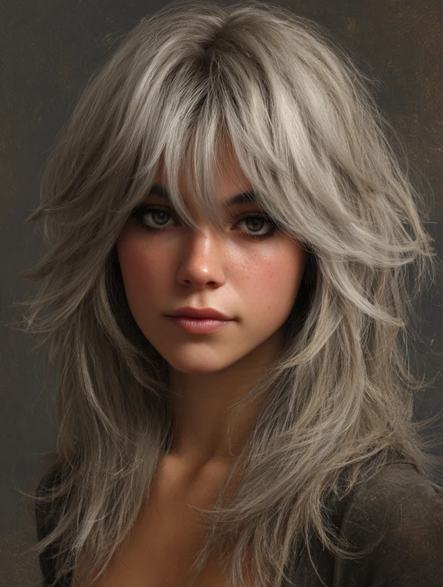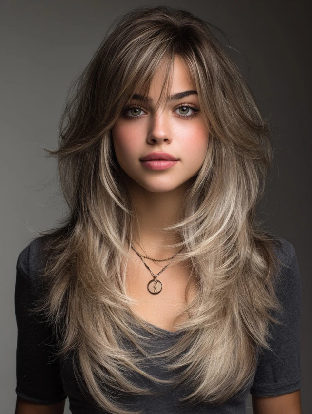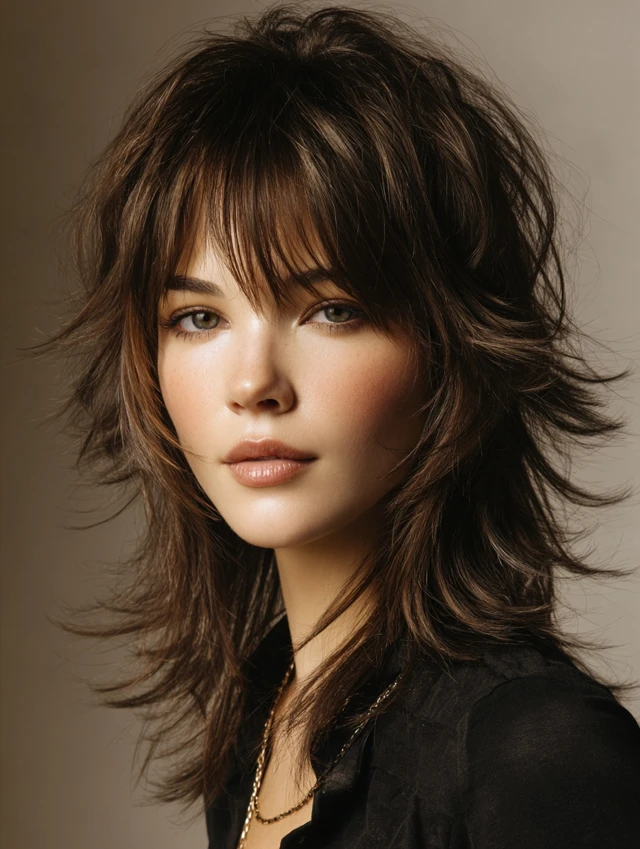 Side-swept bangs soften the forehead and blend seamlessly with choppy, fluffy layers. Works for oval, round, and heart-shaped faces. Medium to thick hair holds bangs and layered ends naturally.
