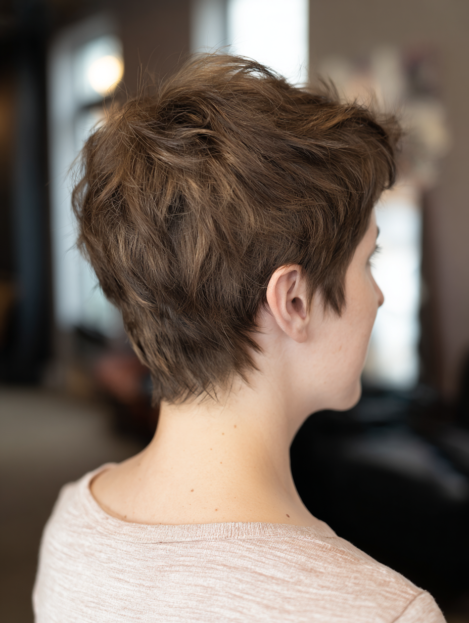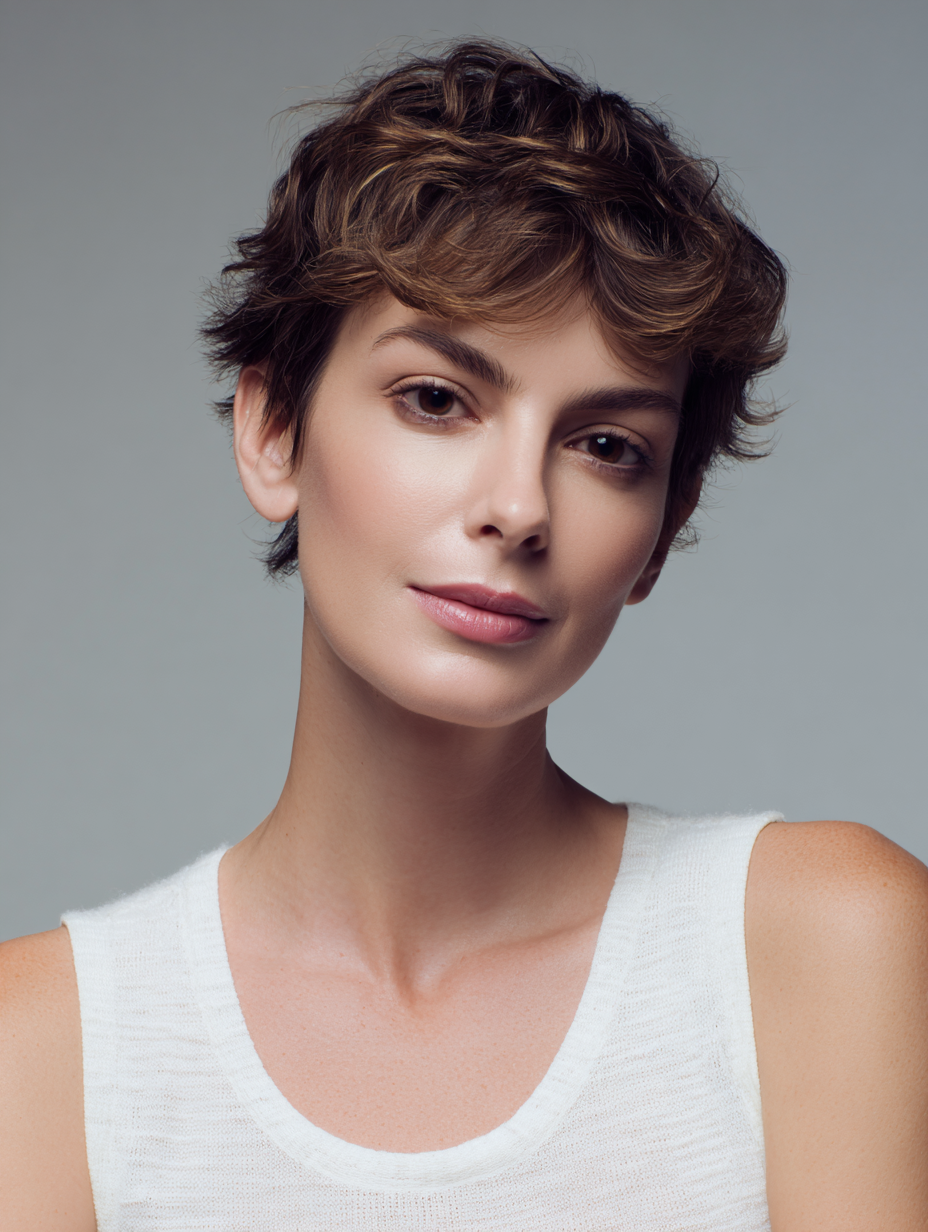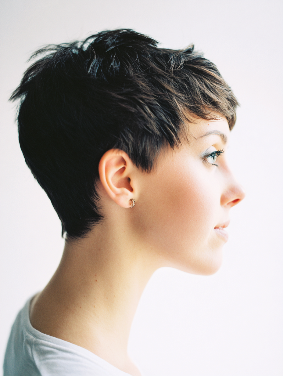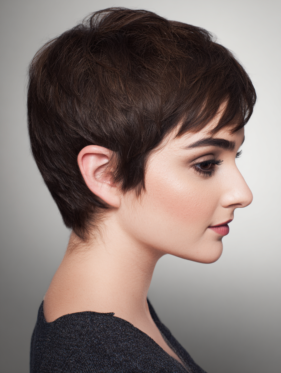 A textured formal pixie adds controlled movement that feels polished without looking stiff. The short layers create shape that flatters oval, square, and heart-shaped faces.