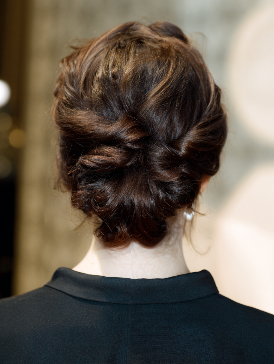 This look simplifies event prep because it requires minimal styling time. Use a flat iron for smoothness and finish with a lightweight serum. The tucked detail keeps the shape neat while guiding attention upward. It works for weddings, dinners, and corporate events because it feels refined yet effortless.