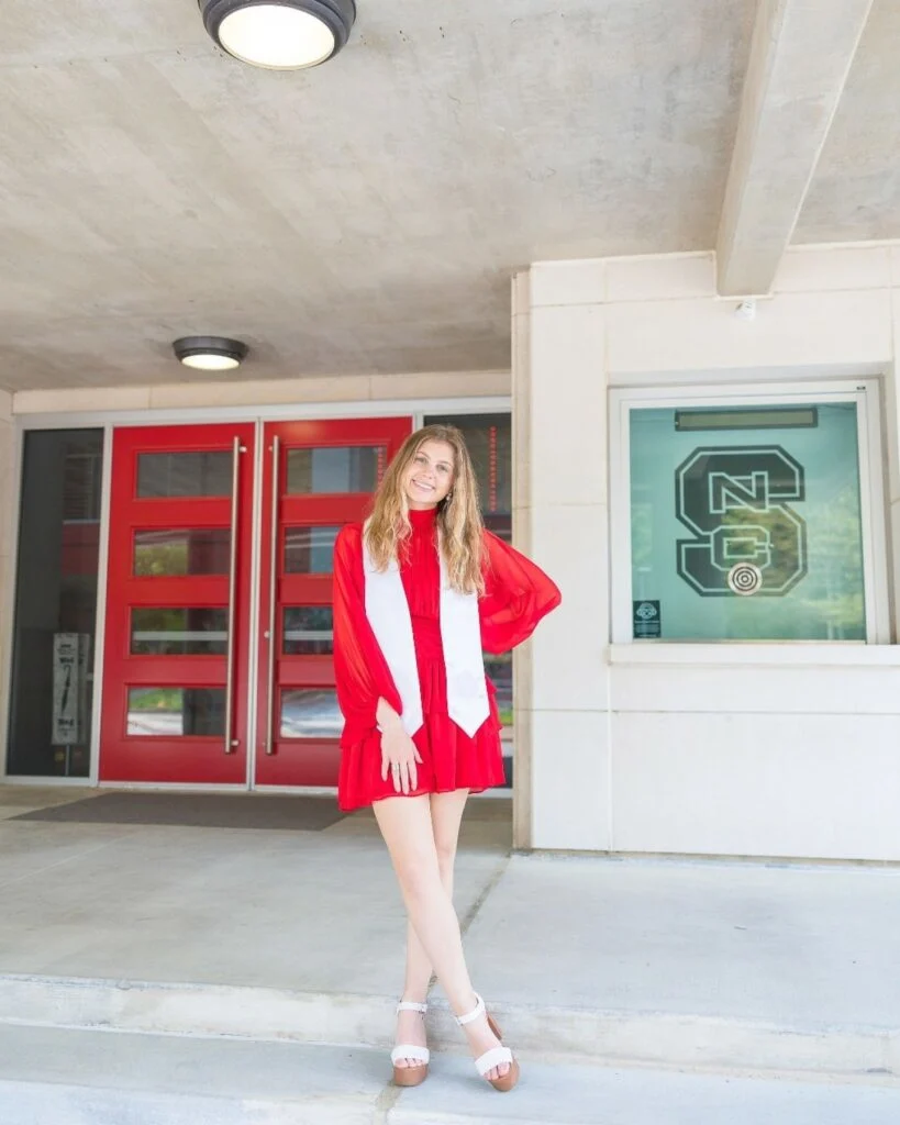The color alone radiates confidence, joy, and celebration—perfect for a big moment like graduation. Paired with delicate silver heels featuring ribbon straps, this look blends boldness with elegance. It’s a cheerful, standout outfit that ensures all eyes are on the graduate.