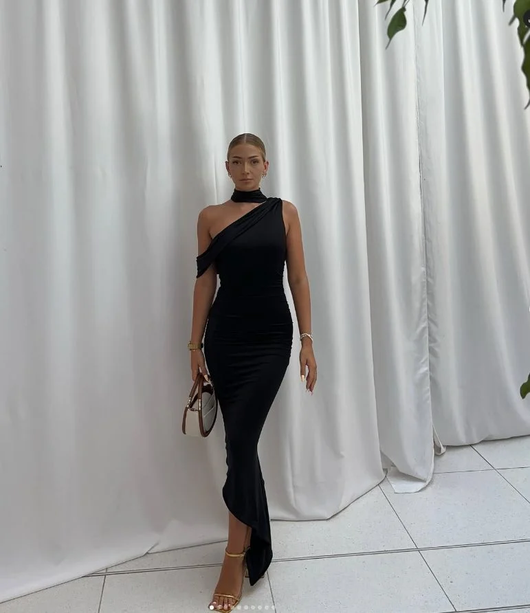 This sleek black dress delivers an effortlessly elegant and fashion-forward vibe, ideal for a graduate who loves a dramatic touch. The asymmetrical neckline with a built-in choker detail adds a modern twist, while the body-hugging fit enhances confidence and grace.