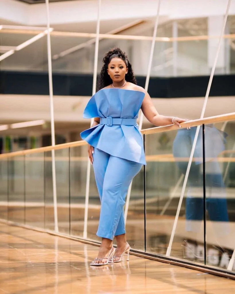 This bold blue pantsuit is a standout choice for the graduate who wants to mix elegance with innovation. The one-shoulder structured top features a dramatic sculptural design and belted waist, giving a striking hourglass silhouette.