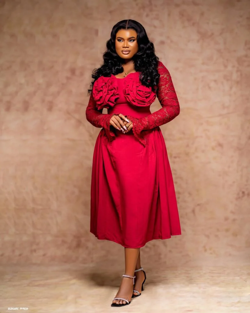 The fitted bodice features stunning oversized rosettes that create a bold and romantic statement, while the lace sleeves add texture and elegance. The A-line skirt offers gentle volume and movement, balancing drama with sophistication. Paired with delicate black heels and soft curls, this look feels regal and feminine. It’s ideal for a graduate who loves to stand out in a stylish yet graceful way.
