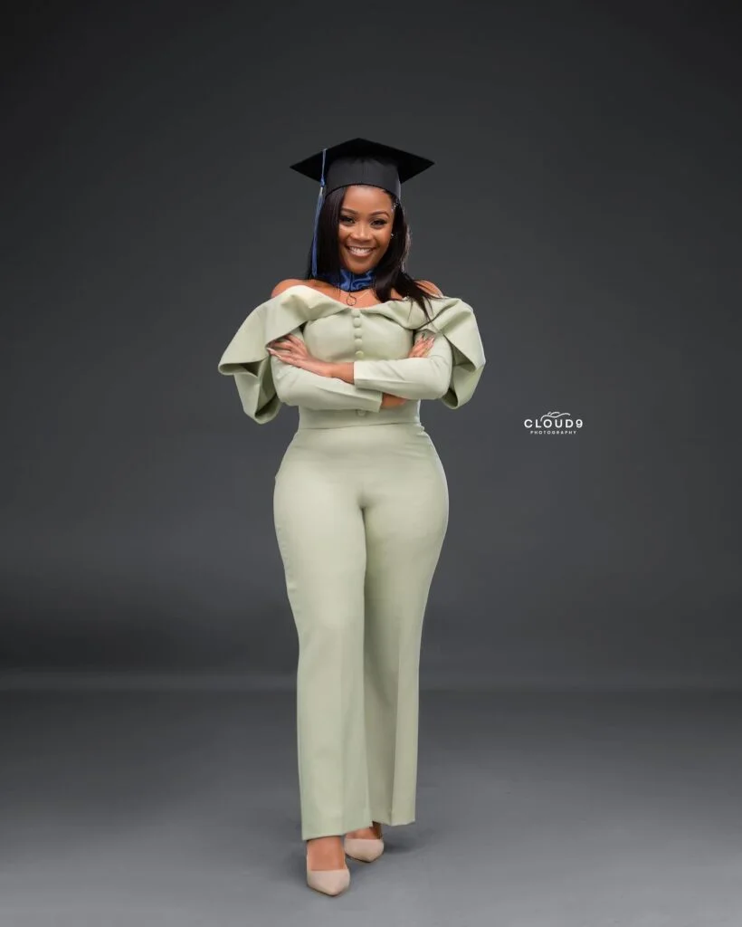 Paired with matching high-waisted pants and nude heels, the outfit is both flattering and comfortable. Topped off with a graduation cap, it blends celebration and sophistication effortlessly. This look is perfect for the graduate who’s confident, trendy, and ready to stand out.