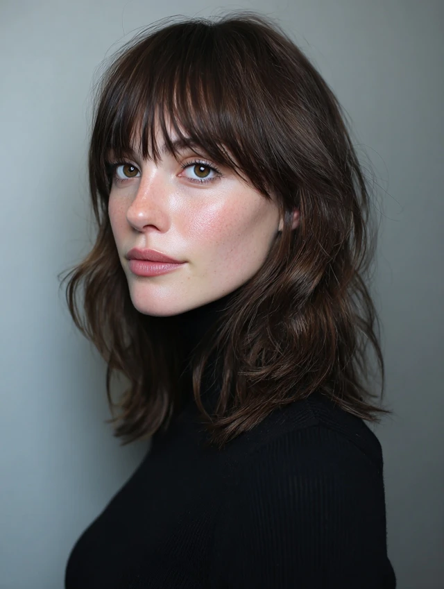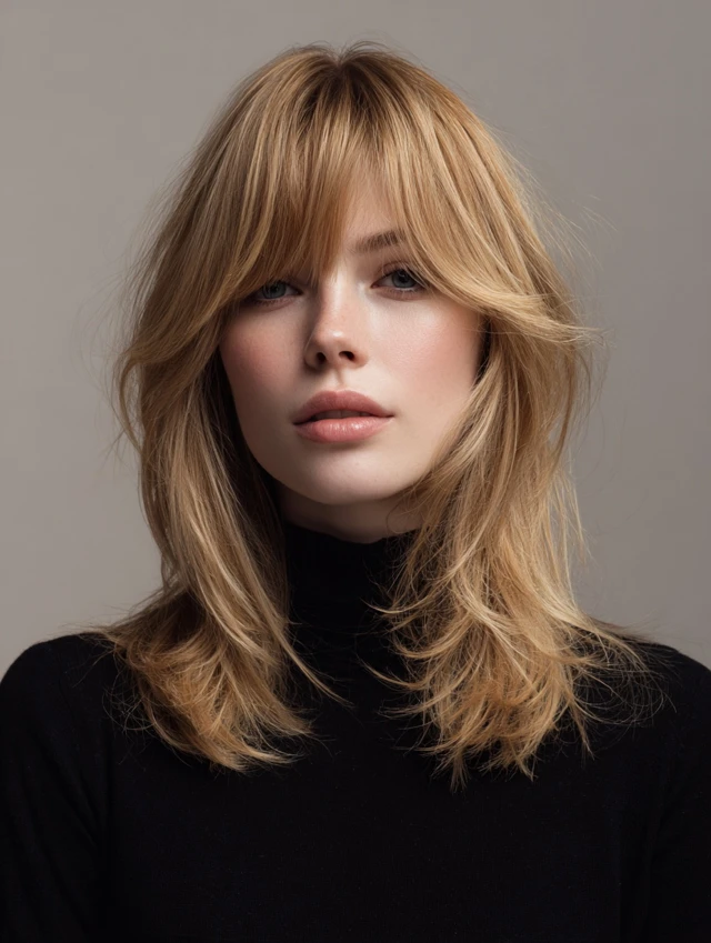 Side-swept bangs combined with wavy hair add depth and visual fullness. The bangs soften the face while drawing attention to the eyes. Layers around the bangs help thin hair appear thicker and more textured.
