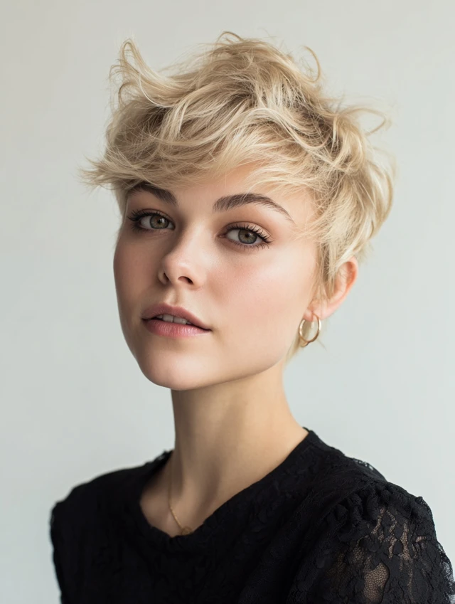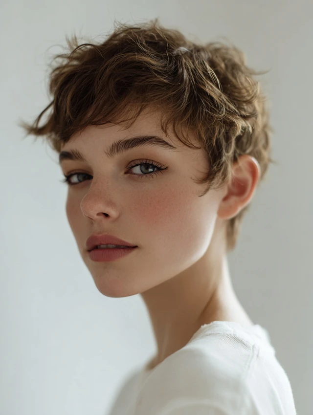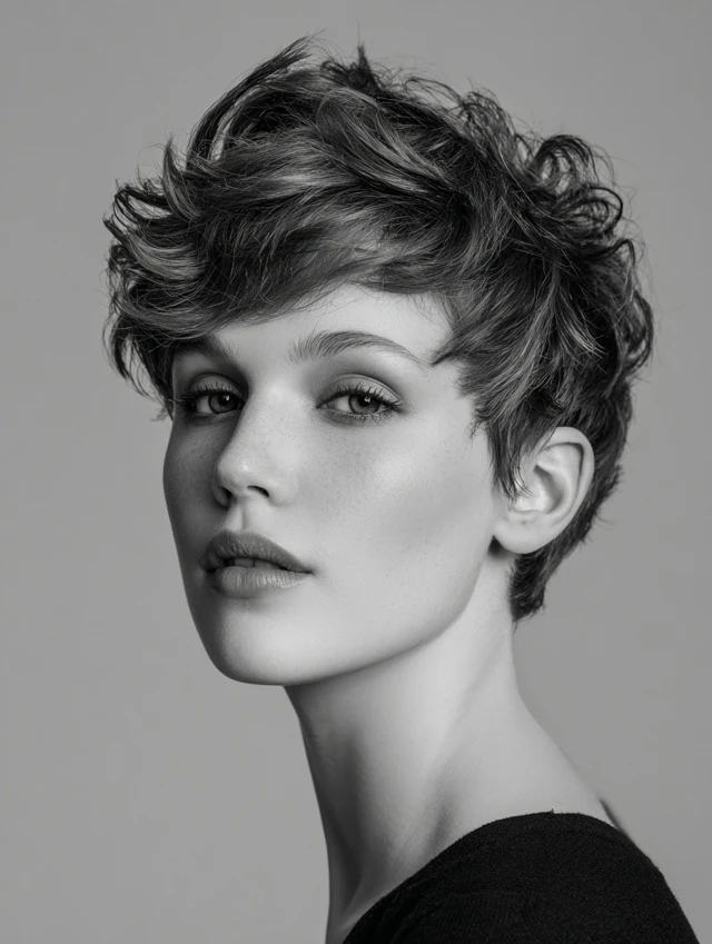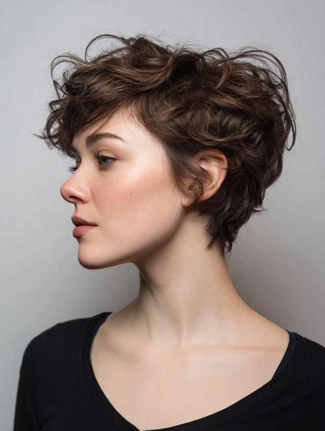 A wavy pixie cut keeps hair short while emphasizing texture. The cut highlights natural waves at the crown, creating volume and dimension. Short sides make the top look fuller and airy.