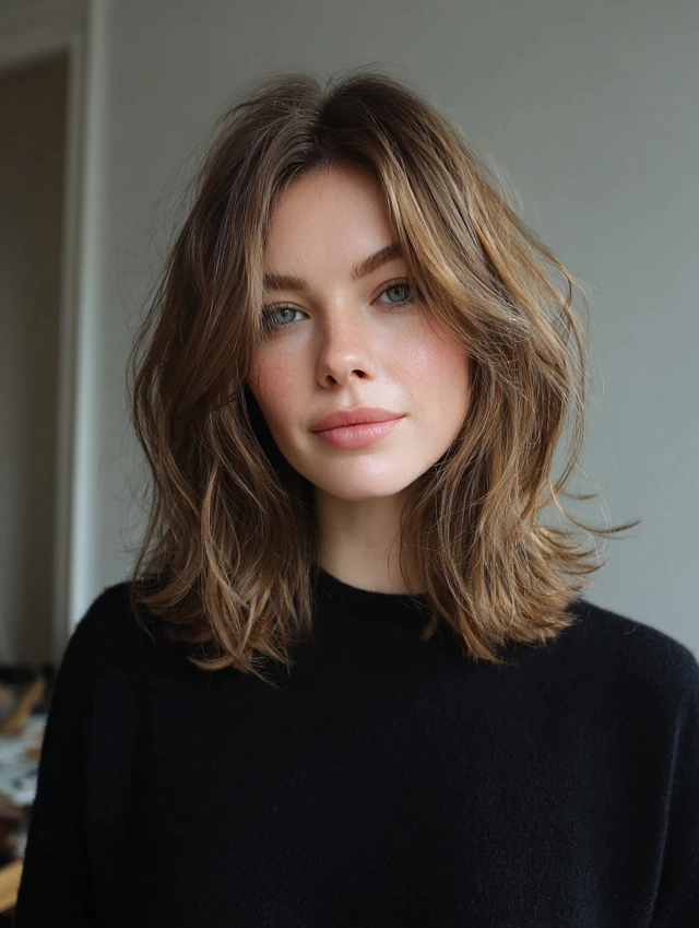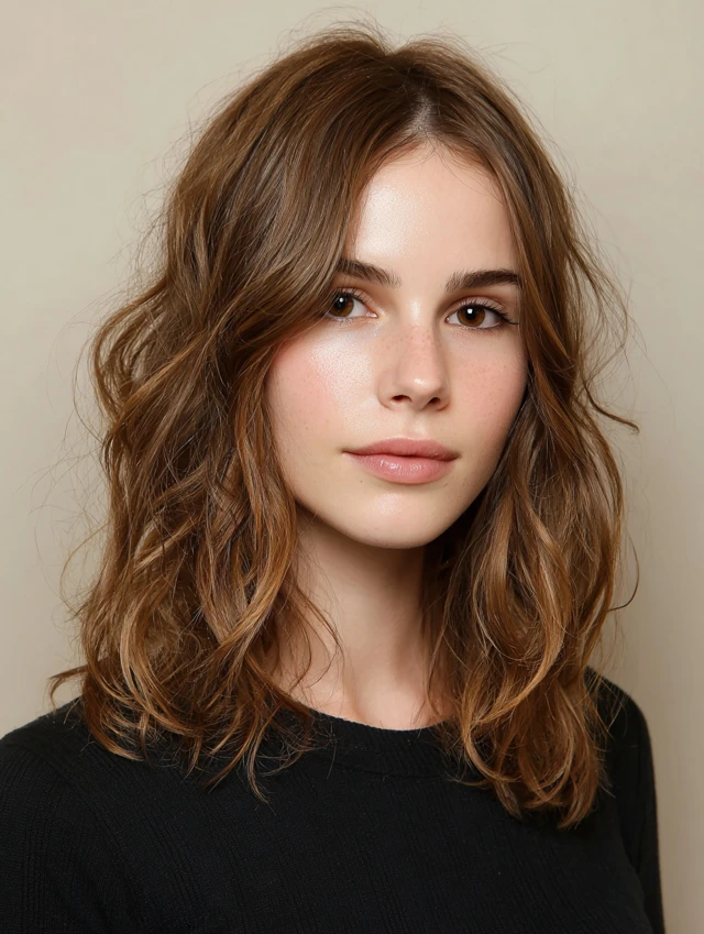 Oval and round faces look best with this style. Medium wavy hair holds the layers well. Perfect for creative or casual lifestyles. Add sea salt spray and scrunch gently for a tousled, effortless finish. Regular trims keep layers fresh.