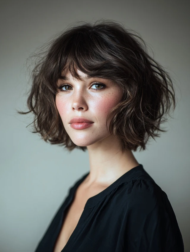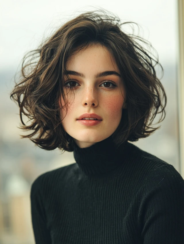 A short wavy bob keeps hair light while boosting volume. The shorter length prevents waves from dragging downward, creating a naturally lifted look. This cut looks playful yet polished, perfect for modern thin hair styling.
