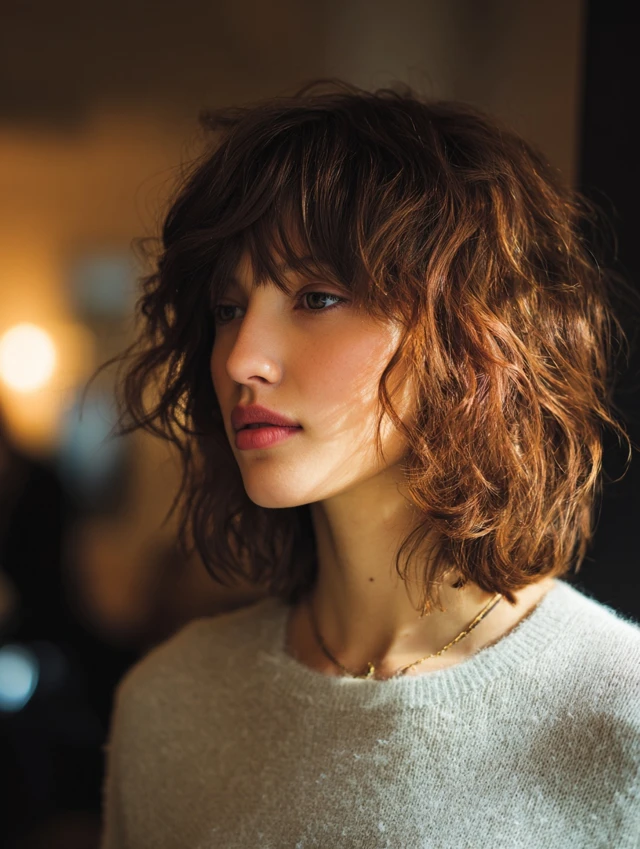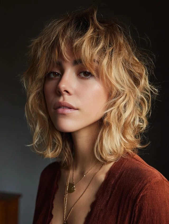 A shaggy cut emphasizes waves and texture. Choppy layers throughout the hair create movement and the illusion of density. It’s ideal for thin hair because it avoids flat, heavy ends.