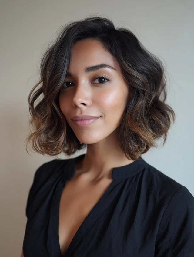 A layered shoulder-length cut enhances natural waves while adding dimension. Layers remove bulk from the ends, allowing hair to bounce freely and look fuller. This cut frames the face and gives movement without making hair appear thin or flat.