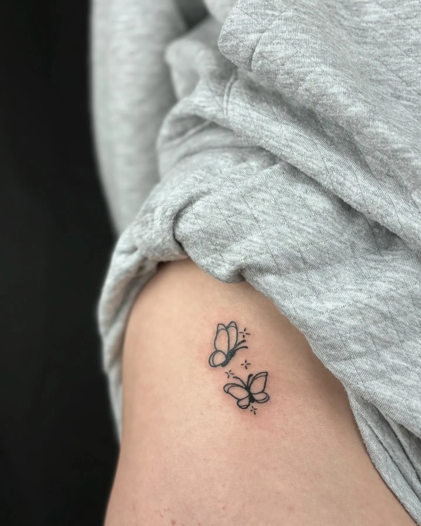 This small hip tattoo features two minimalist butterflies surrounded by tiny spark-like dots.