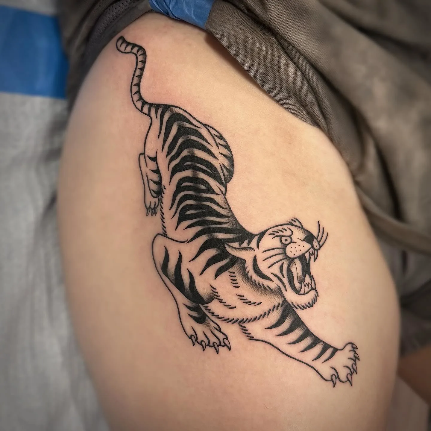 This bold hip tattoo features a traditional-style tiger mid-pounce, its body stretched with powerful movement and energy.