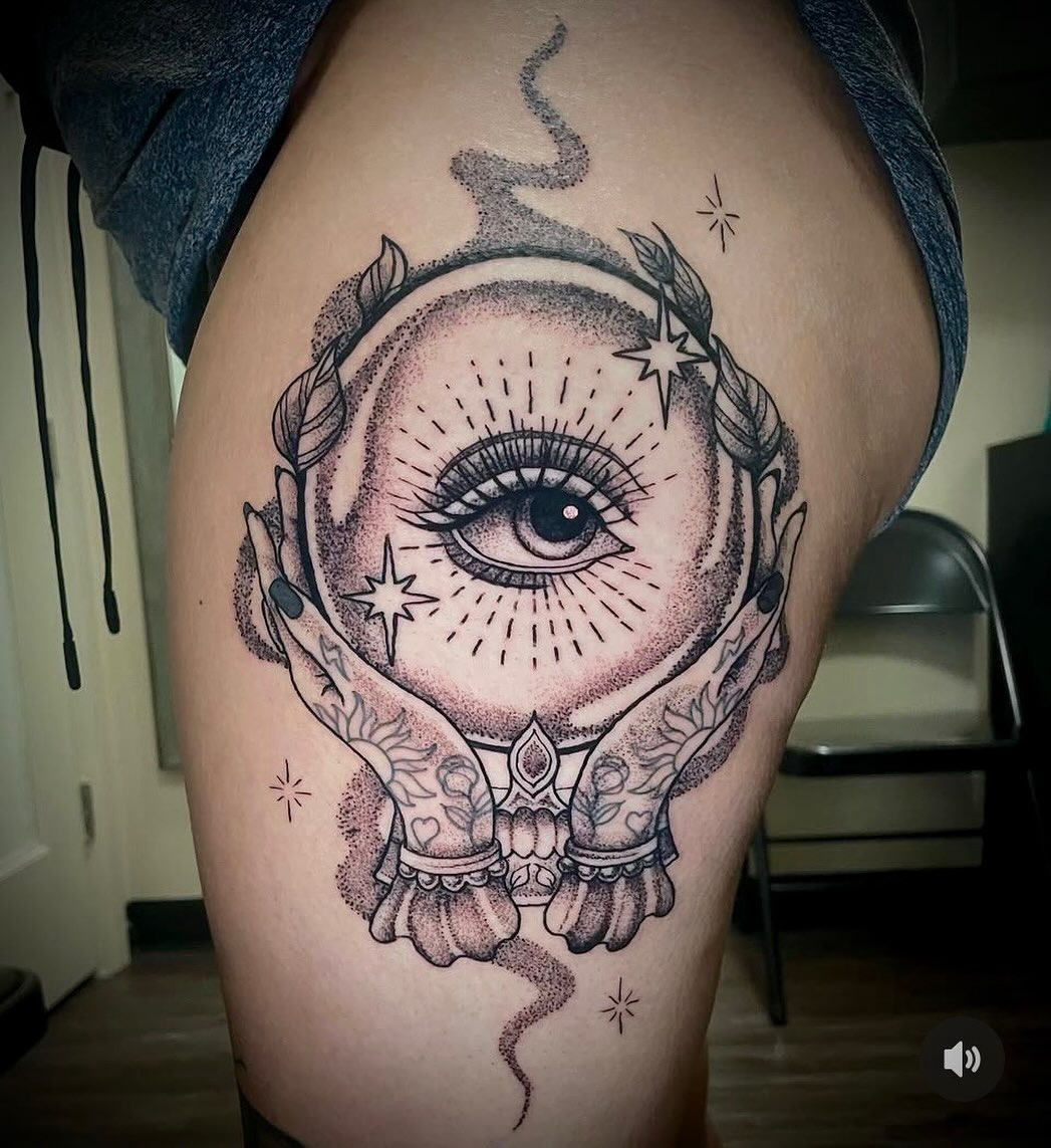 This mystical hip tattoo centers on a single eye surrounded by ornate hands, stars, and leafy details.