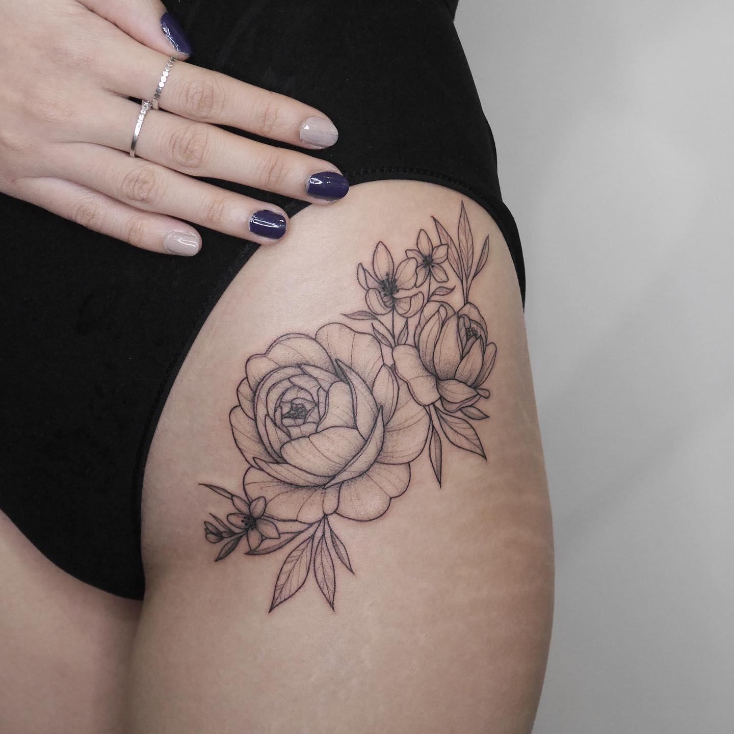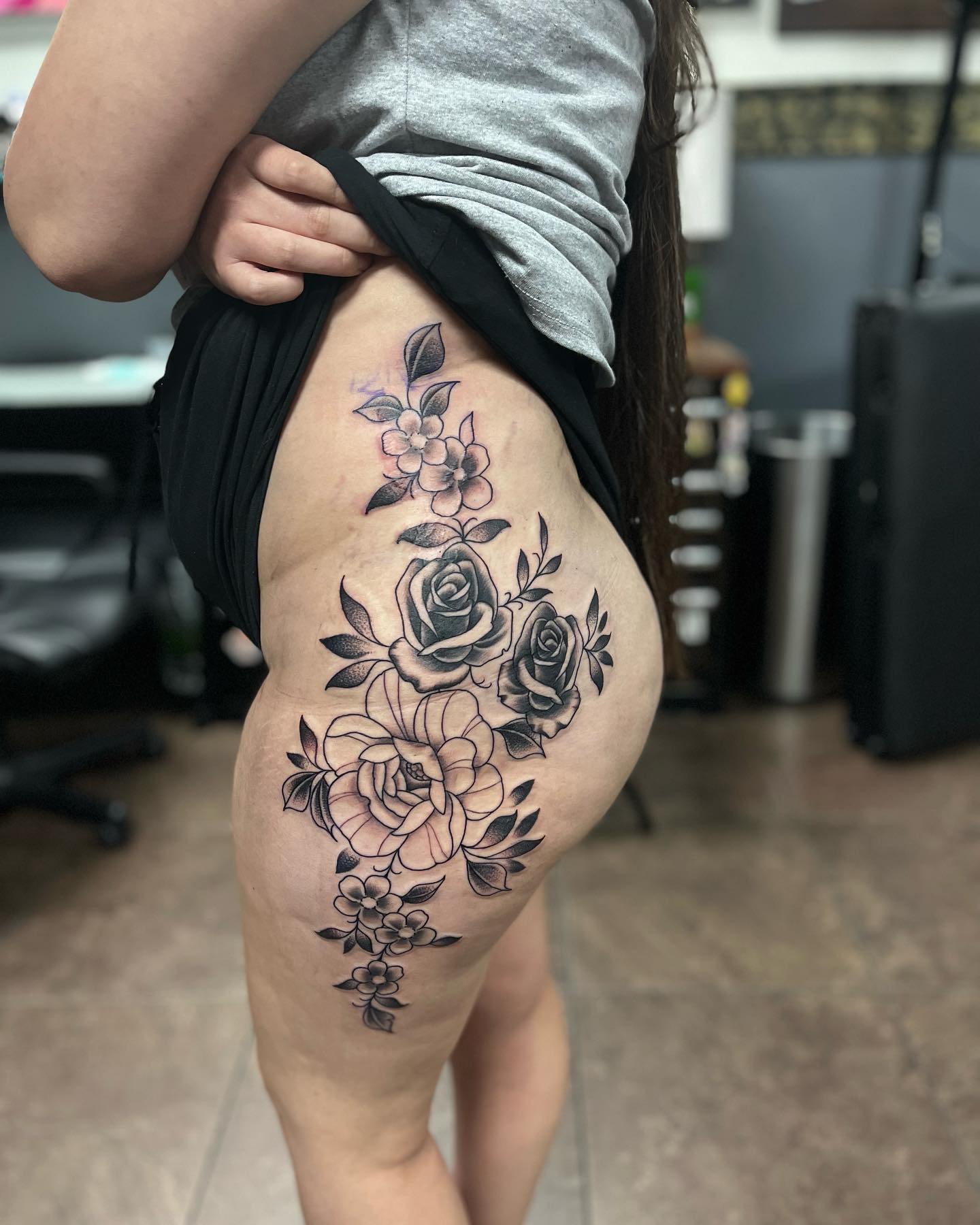 Smaller flowers and leafy accents flow naturally along the curve of the hip, adding balance and movement. The placement feels both intimate and graceful, emphasizing femininity and strength.
