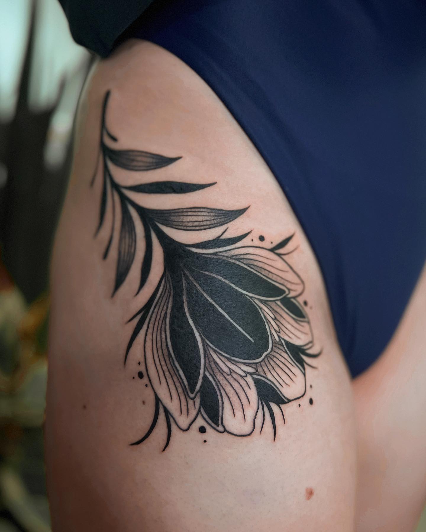 The tattoo’s placement enhances the thigh’s contour, balancing dark and delicate elements.