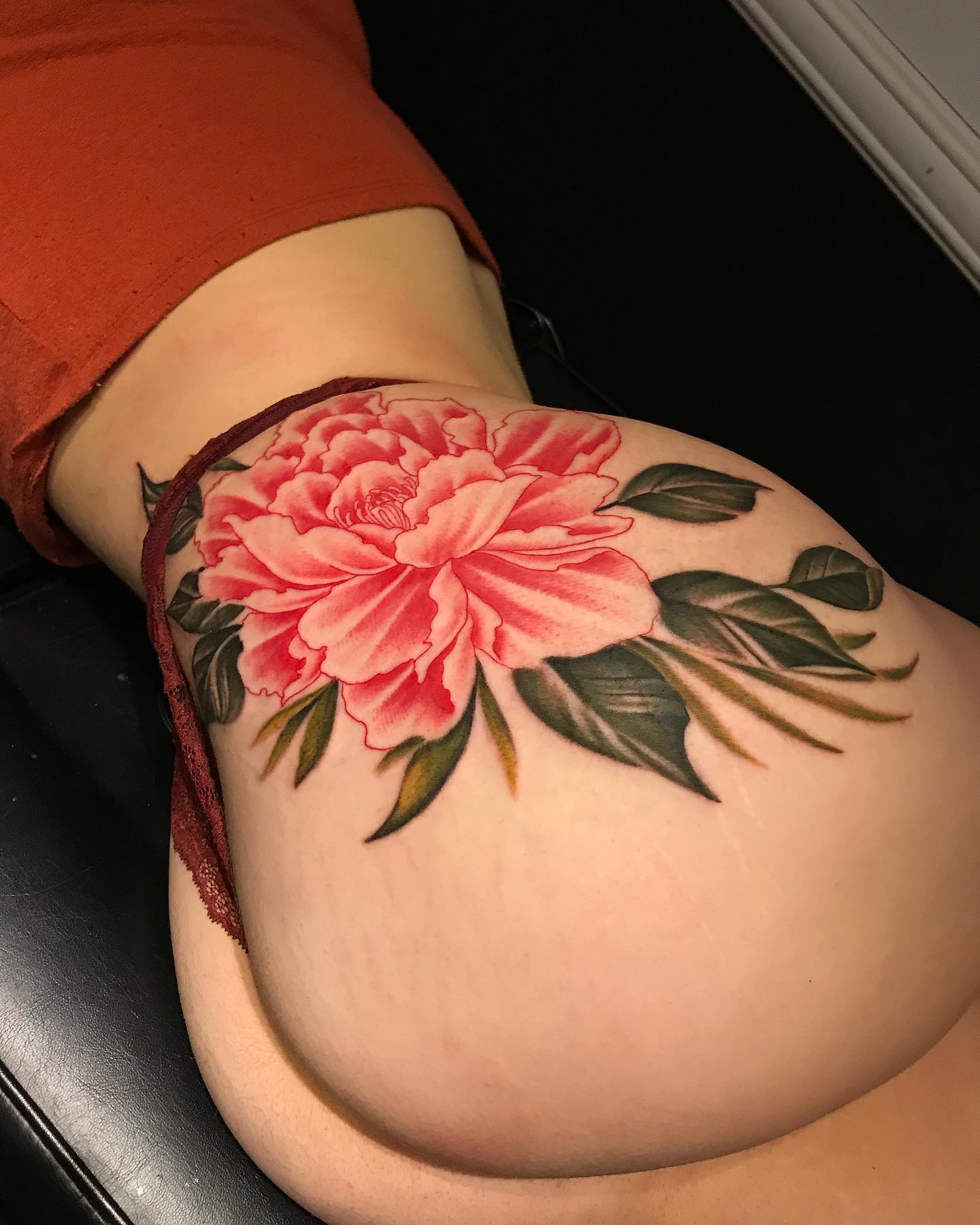 Each petal curls gracefully outward, giving the flower depth and character. The placement enhances the natural shape of the hip, balancing strength and femininity.