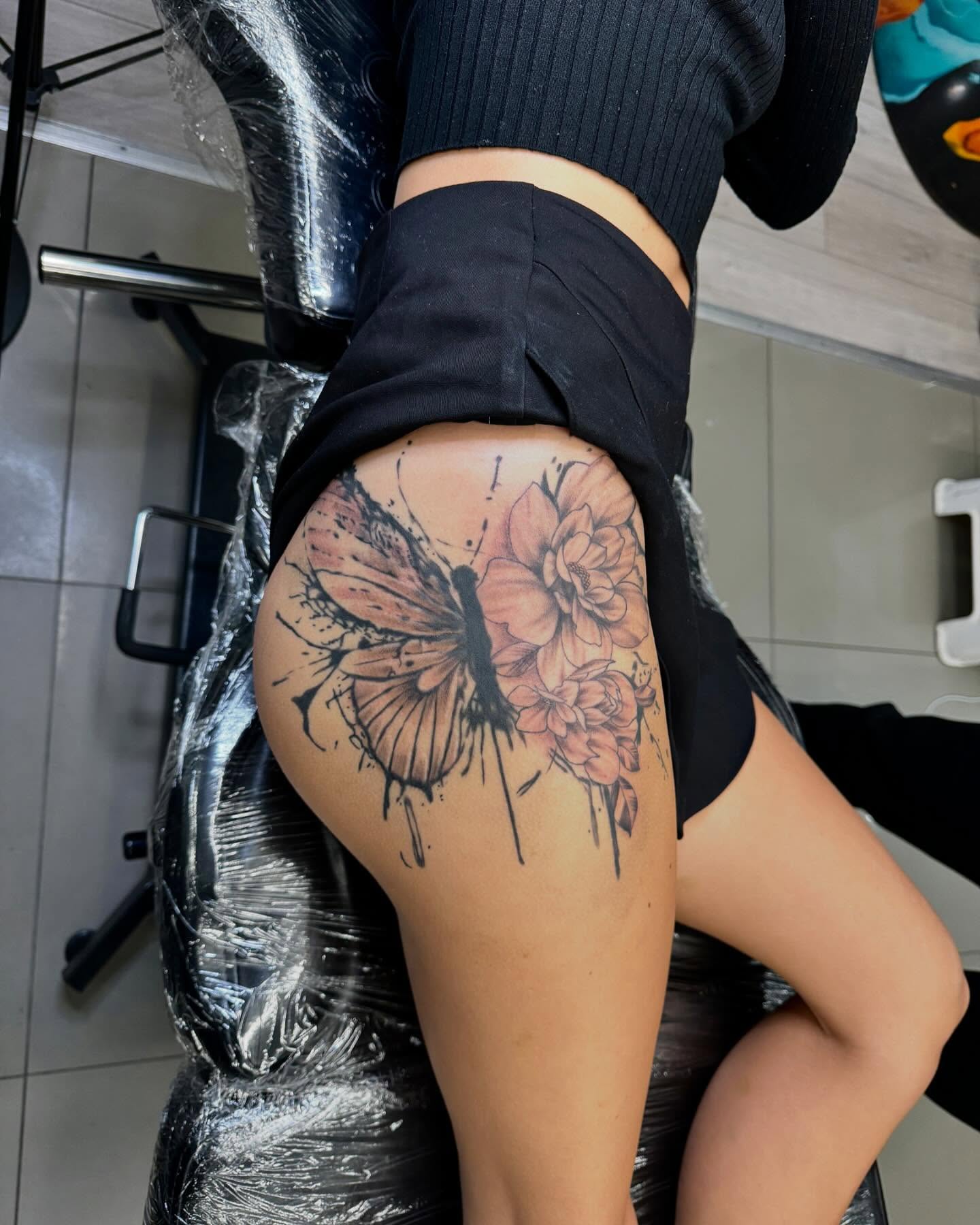 This stunning hip tattoo blends a large butterfly with blooming dahlias, merging realism and abstract art.