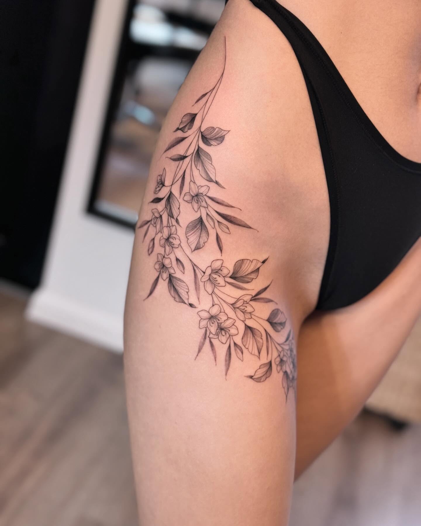The open blossoms and detailed leaves move harmoniously across the hip, enhancing the body’s shape.