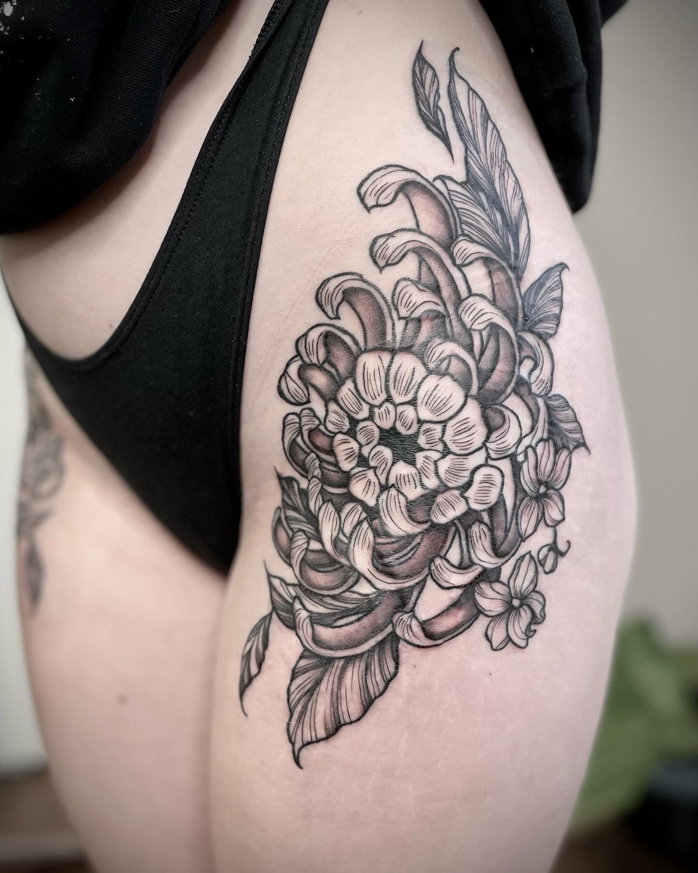 This hip tattoo showcases a bold chrysanthemum with detailed petals and flowing leaves that hug the body’s curve.